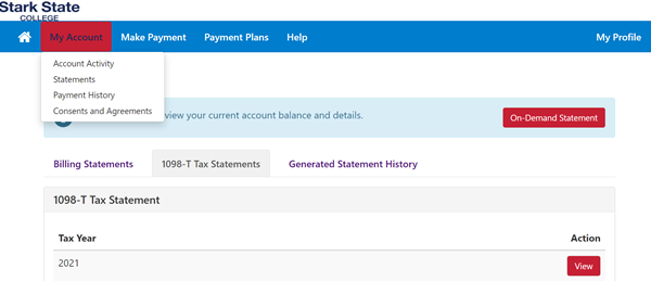 In the myBill+payment portal, click on the My Accounts tab, select Statements and 1098-T. Choose tax year and your form will be available to download for printing.